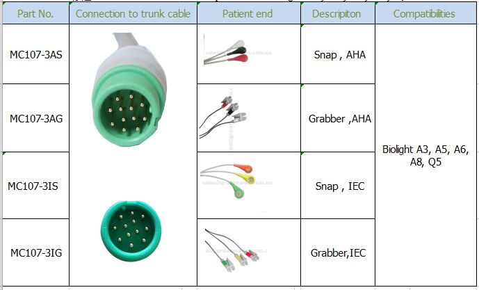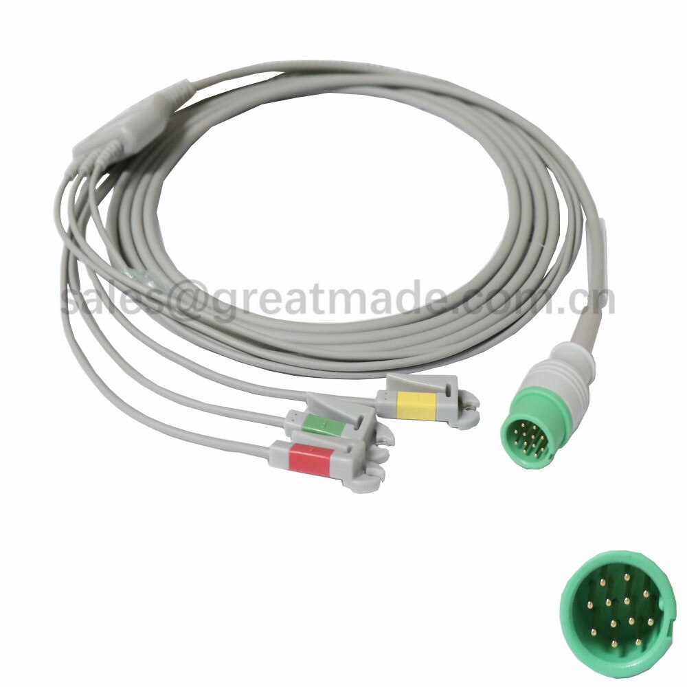 Kabel Biolight A3, A5, A6, A8, Q5 yang kompatibel dengan leadwiresie. IEC, 3-Lead, grabber, 12pin hijau