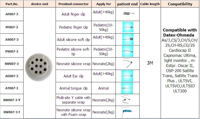 AF007-3 Kompatibel dengan Datex-Ohmeda As / 3, CS / 3, CH / S, CH / 2S, CH-RS, CG / 2S Cardiocap II Capnomac Ultima, monitor cahaya, m-Estpr. Oscar II, OSP-200 Satlite Trans, Satlite Trans Plus, ULTSVI, ULTSVO, ULTSIO ULT200