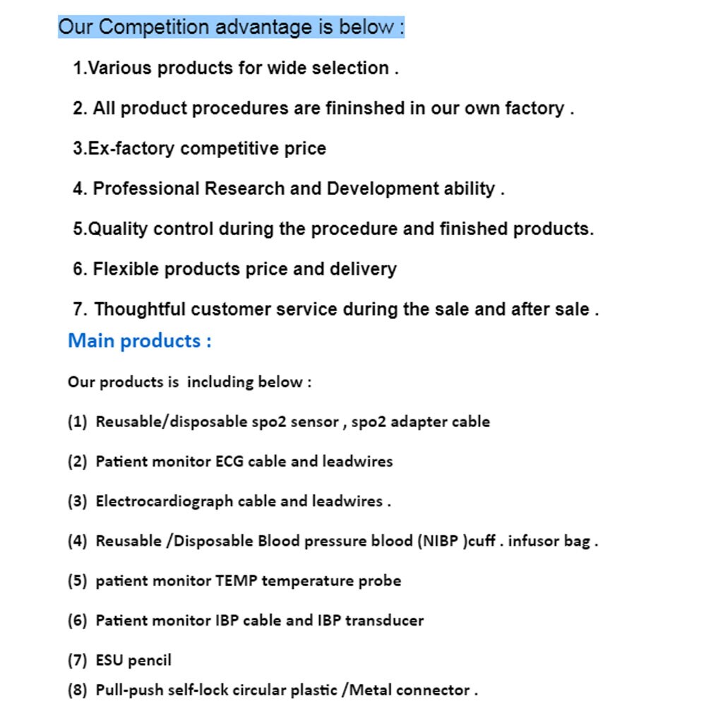 Shenzhen Greatmade Tech LTD adalah produsen prefessional kabel medis, yang banyak digunakan dengan monitor pasien multi-parameter, pulse oximeter, perangkat EKG, montior tekanan darah, unit bedah mikro. Kami memiliki pengalaman 10 tahun di bidang ini. Kami memiliki pabrik kami sendiri di Shenzhen Cina Daratan, dan memiliki perangkat manufaktur yang lengkap dan perangkat uji. Kami juga membangun tim Penelitian dan Pengembangan profesional untuk memenuhi berbagai kebutuhan pasar. Kualitas unggul kami, harga menguntungkan dan layanan yang bijaksana telah memenangkan dukungan permanen pelanggan nasional dan internasional kami.